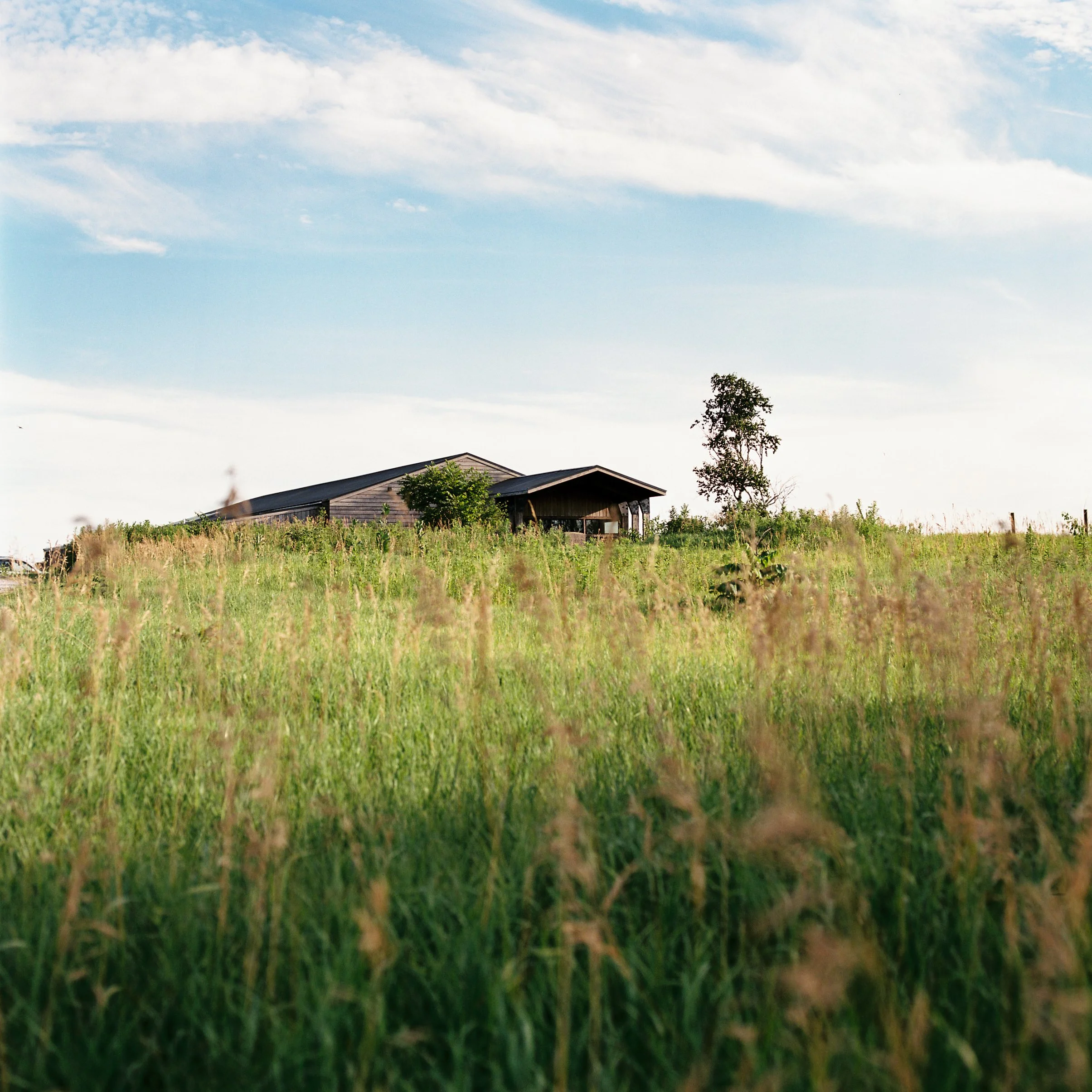Bluestem Hall in the summer prairie.